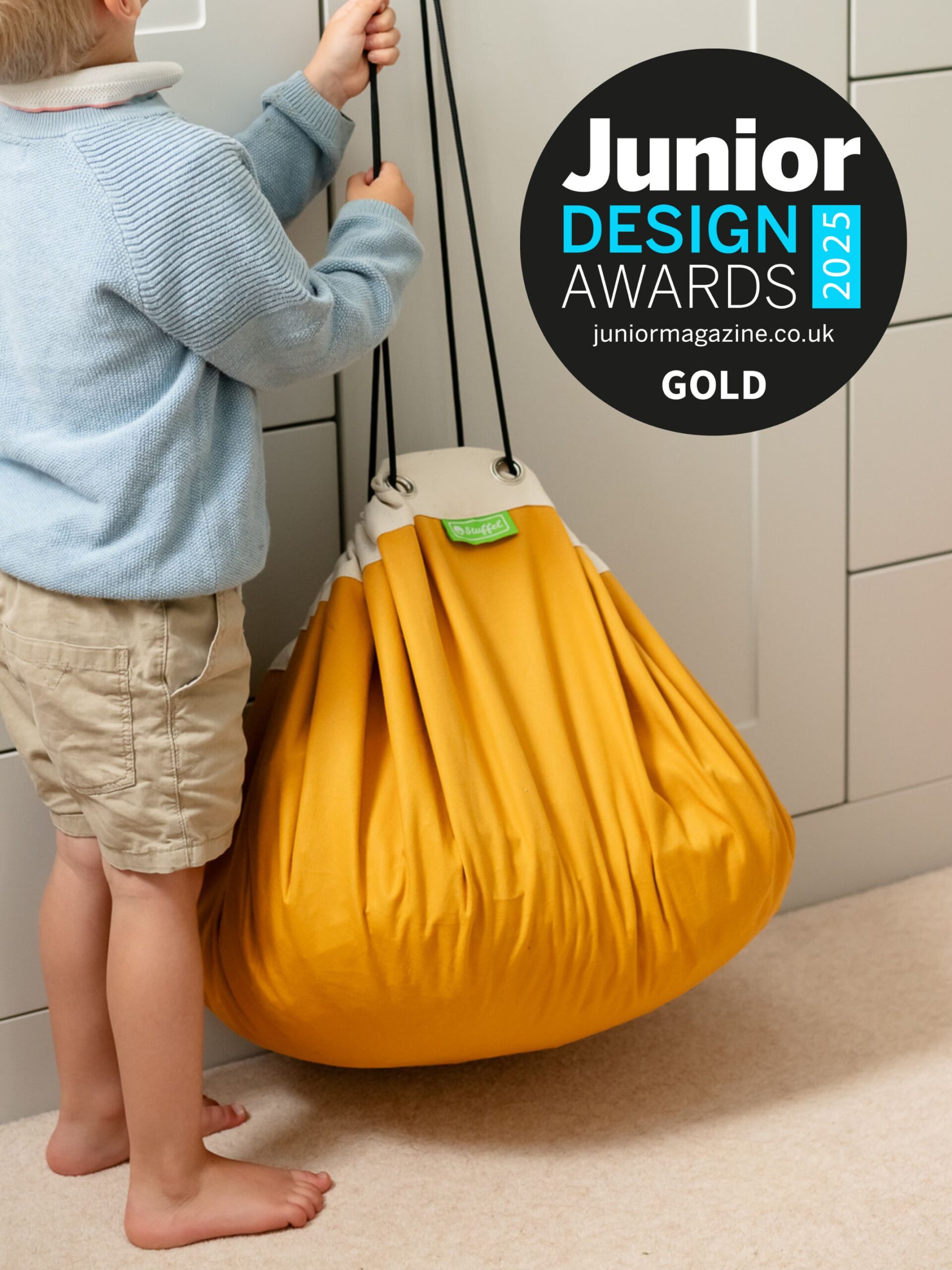 What:Stuffel Original – A 1metre diameter heavy cotton canvas drawstring bag that can store a high volume of toys and unfurls to become a playmat with a high rim that keeps toys contained.
